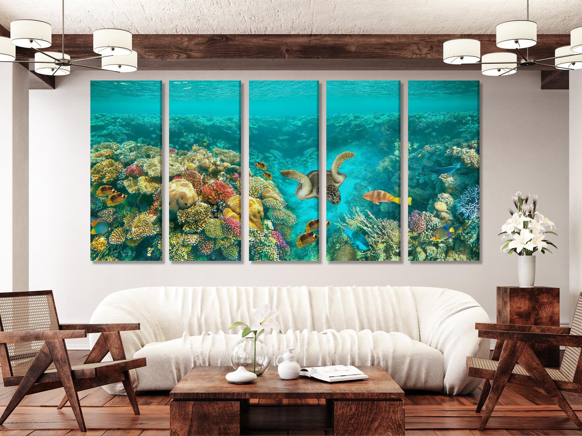 Underwater Coral Reef Canvas Print, Sea Turtle and Tropical Fish Wall Art, Large Ocean Landscape, Marine Life Decor, Vibrant Sea Artwork