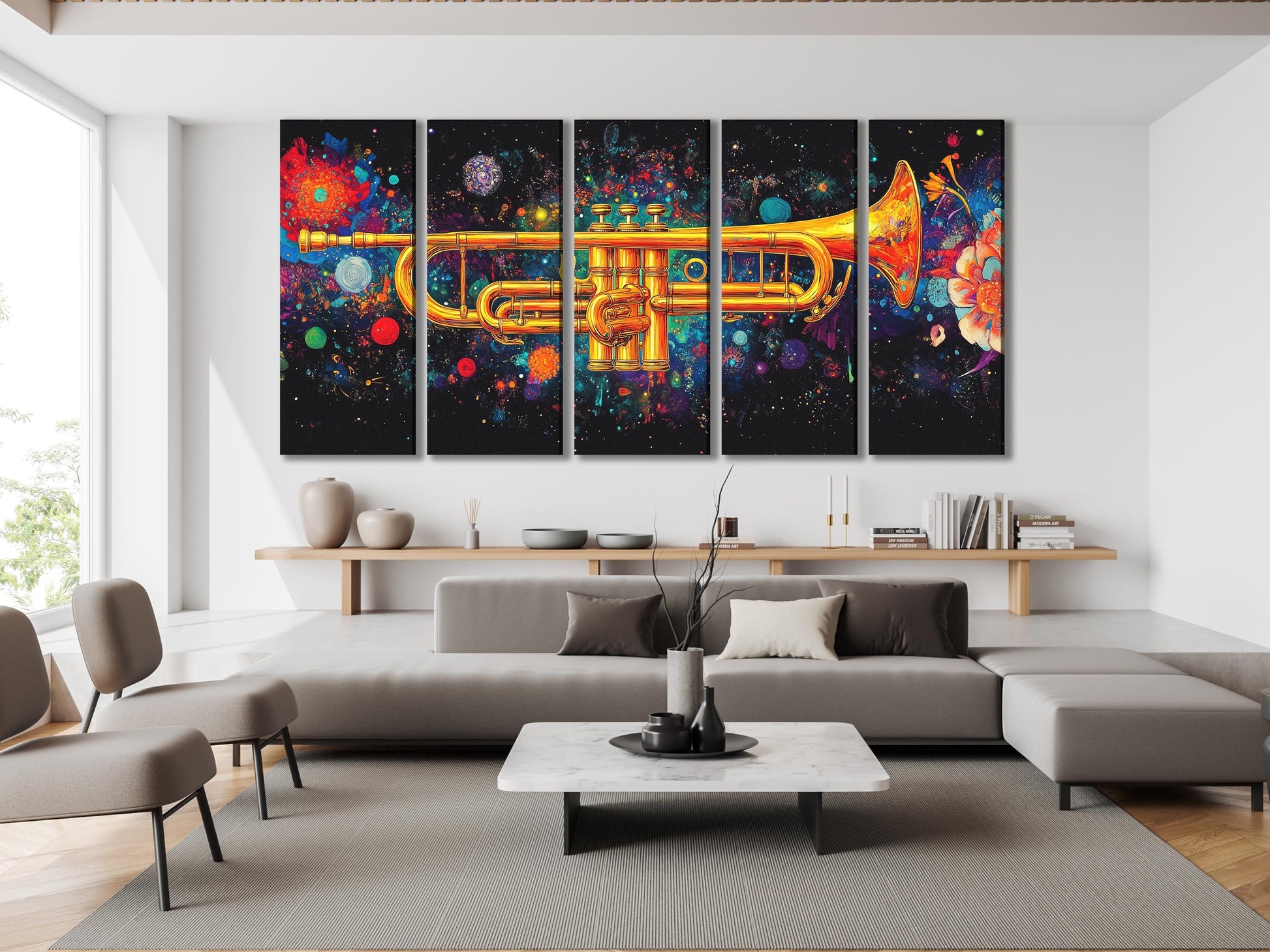 Art mural Trompette - Impression sur toile colorée de jazz, œuvre d'art abstraite d'instrument de musique, cadeau pour musicien, décor de studio, art mural moderne pour salon