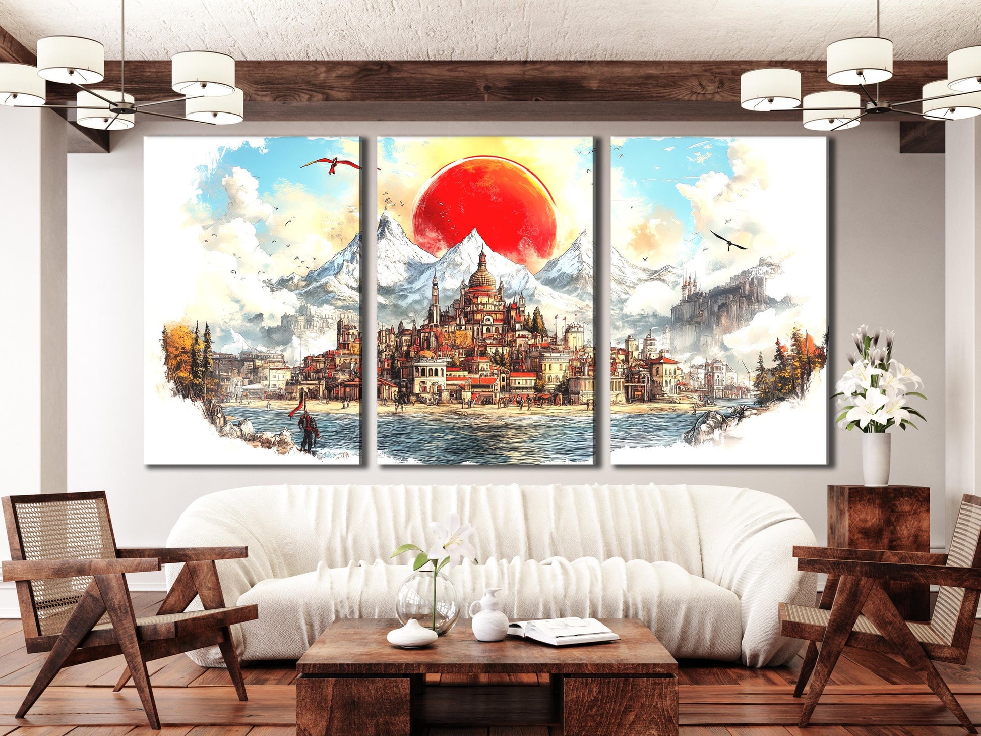 추상 판타지 월 아트로 장엄한 아름다움에 푹 빠져보세요. 이 캔버스 프린트는 장엄한 산악 도시 풍경, 중세 도시의 매력, 그리고 강렬한 붉은 태양을 담아내어, 아름다운 판타지 풍경을 집안으로 불러들이기에 완벽합니다.