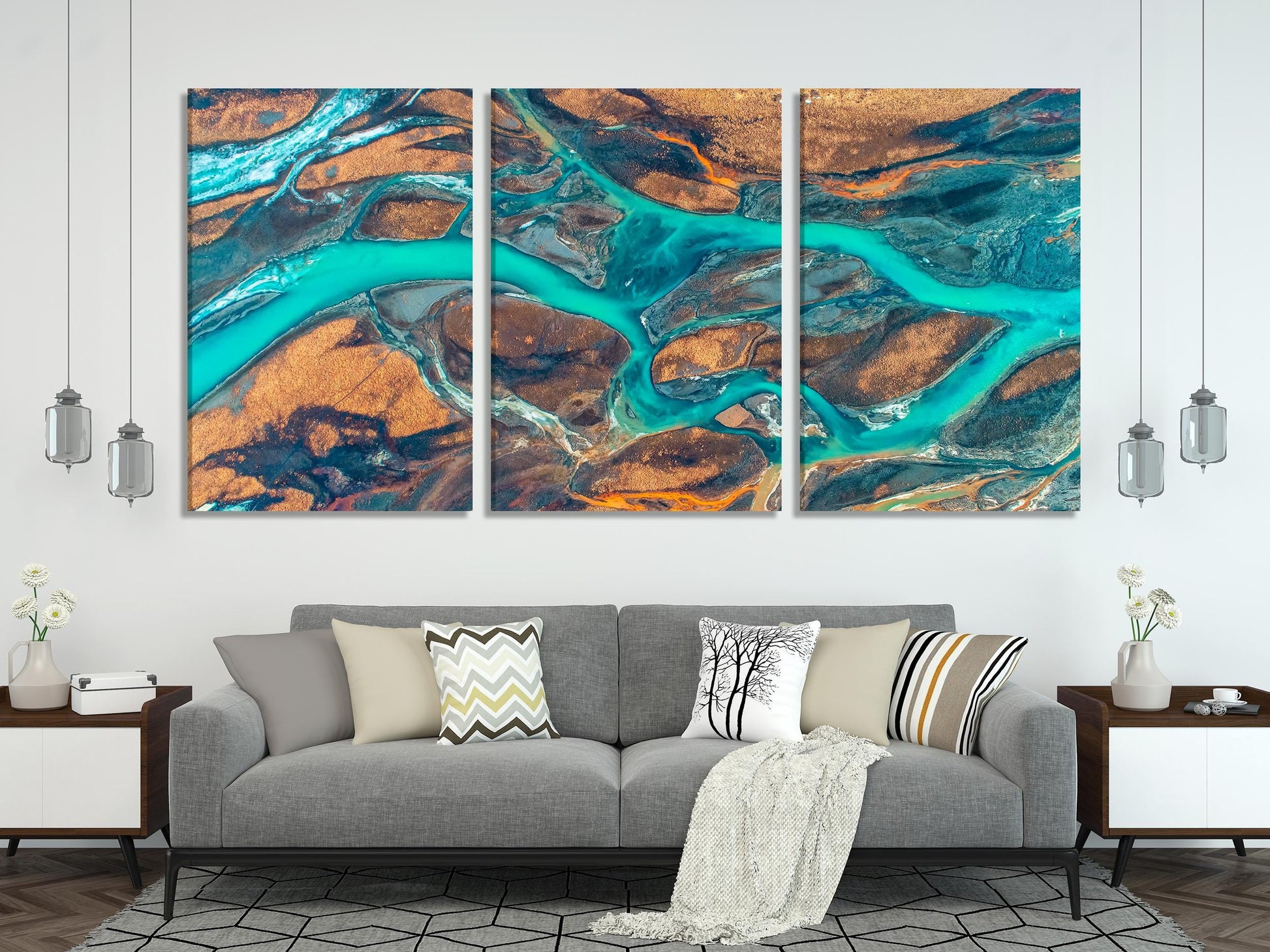 추상 풍경 벽 예술 - 아이슬란드 강 공중 캔버스 프린트, 대형 5패널 강 예술 작품, 청록색 물 흐름, 흙빛 자연 장식