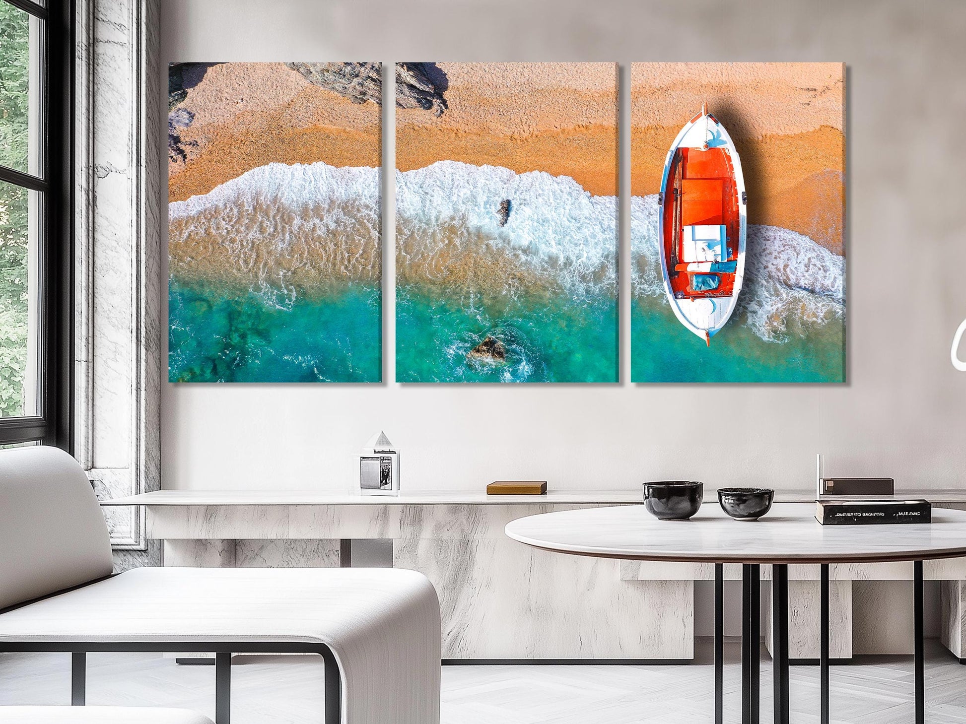 에게해 섬 어선 캔버스, 청록색 바다 위의 그리스 보트 조감도, 수정처럼 맑은 물 벽화, 그리스 해안 장식 삼부작