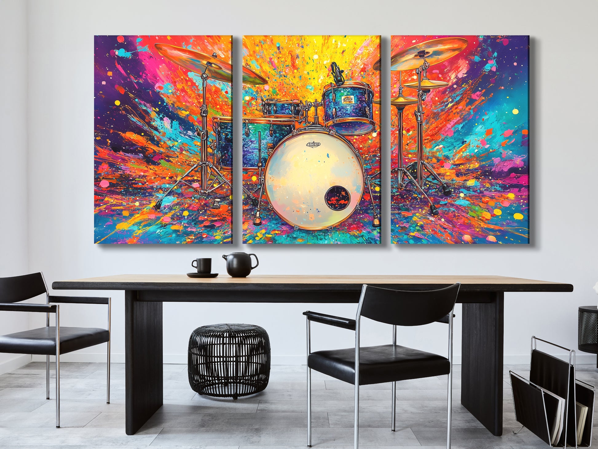 컬러버스트 드럼 키트 캔버스 프린트 – 강렬한 드러머 아트, 폭발적인 무지개 흩뿌리기 디자인
