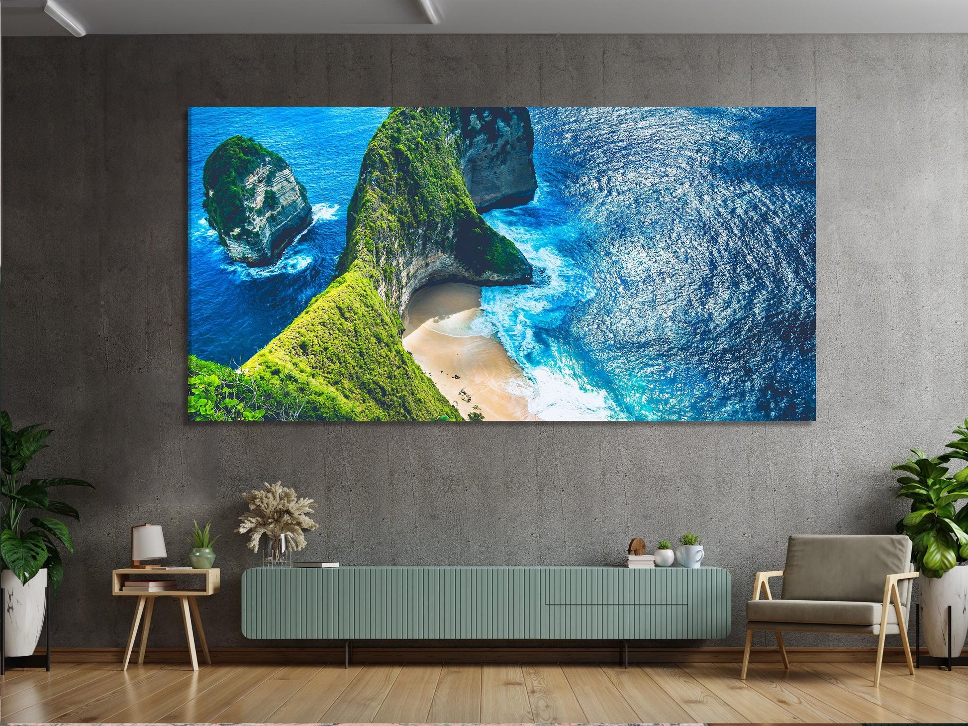 이 대형 캔버스 프린트는 누사 페니다 섬의 켈링킹 해변의 숨 막힐 듯 아름다운 풍경을 담아냈습니다. 상징적인 해안 절벽과 만타 베이의 생동감 넘치는 청록색 바닷물이 어우러져 있습니다. 극적인 풍경과 경이로운 공중 전망은 시선을 사로잡는 시선을 사로잡으며, 발리에서 가장 아름다운 곳의 고요함을 당신의 거실로 옮겨줍니다. 열대 지방의 휴양과 이국적인 풍경을 사랑하는 이에게 완벽한 이 작품은 당신의 집이나 사무실에 낙원의 느낌을 더합니다. 최고급 소재로 제작된 이 대형 바다 풍경 캔버스는 발리 자연의 경이로움이 선사하는 생동감 넘치는 에너지로 당신의 공간을 채워줄 것입니다.