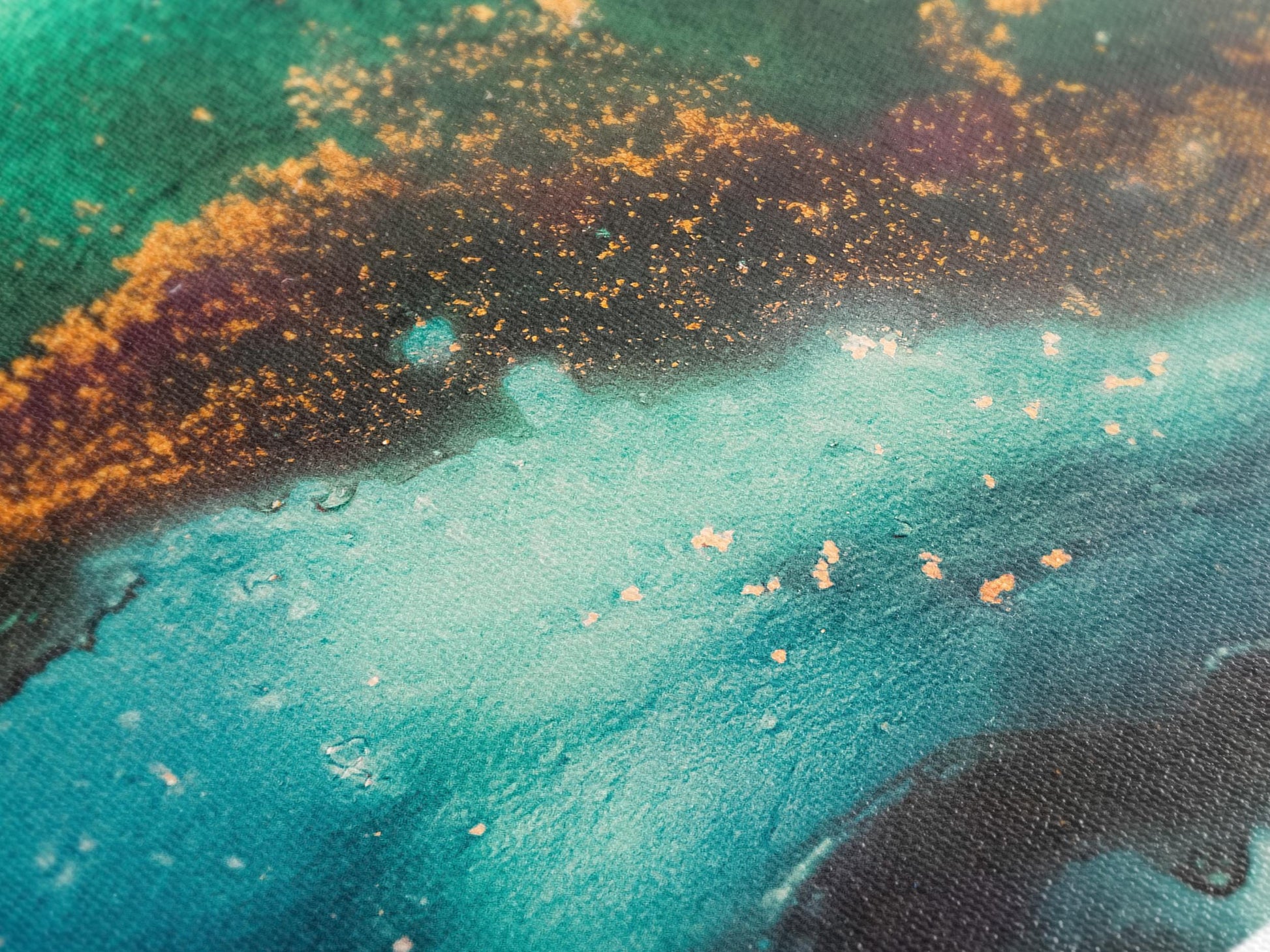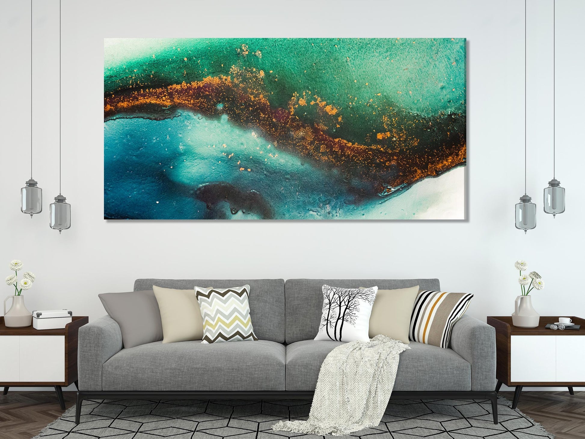 이 대형 추상 미술 작품은 청록색과 에메랄드 그린의 매혹적인 색조에 은은한 금빛 액센트가 어우러져 집이나 사무실에 눈부시게 현대적인 센터피스를 선사합니다. 추상 벽화처럼 디자인된 이 현대적인 추상 캔버스 프린트는 어떤 공간에도 세련미와 깊이를 더합니다. 모던한 인테리어에 완벽하게 어울리는 이 작품은 대담하고 생동감 넘치는 디자인을 좋아하는 분들에게 훌륭한 선택입니다.