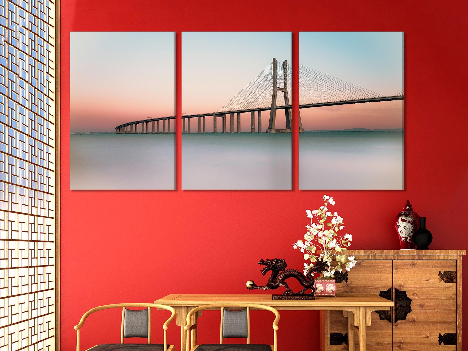 바스코 다 가마 다리 캔버스 프린트, 대형 리스본 벽 예술, 미니멀리스트 일몰 풍경, 모던 유럽 건축 예술 작품, 해안 캔버스