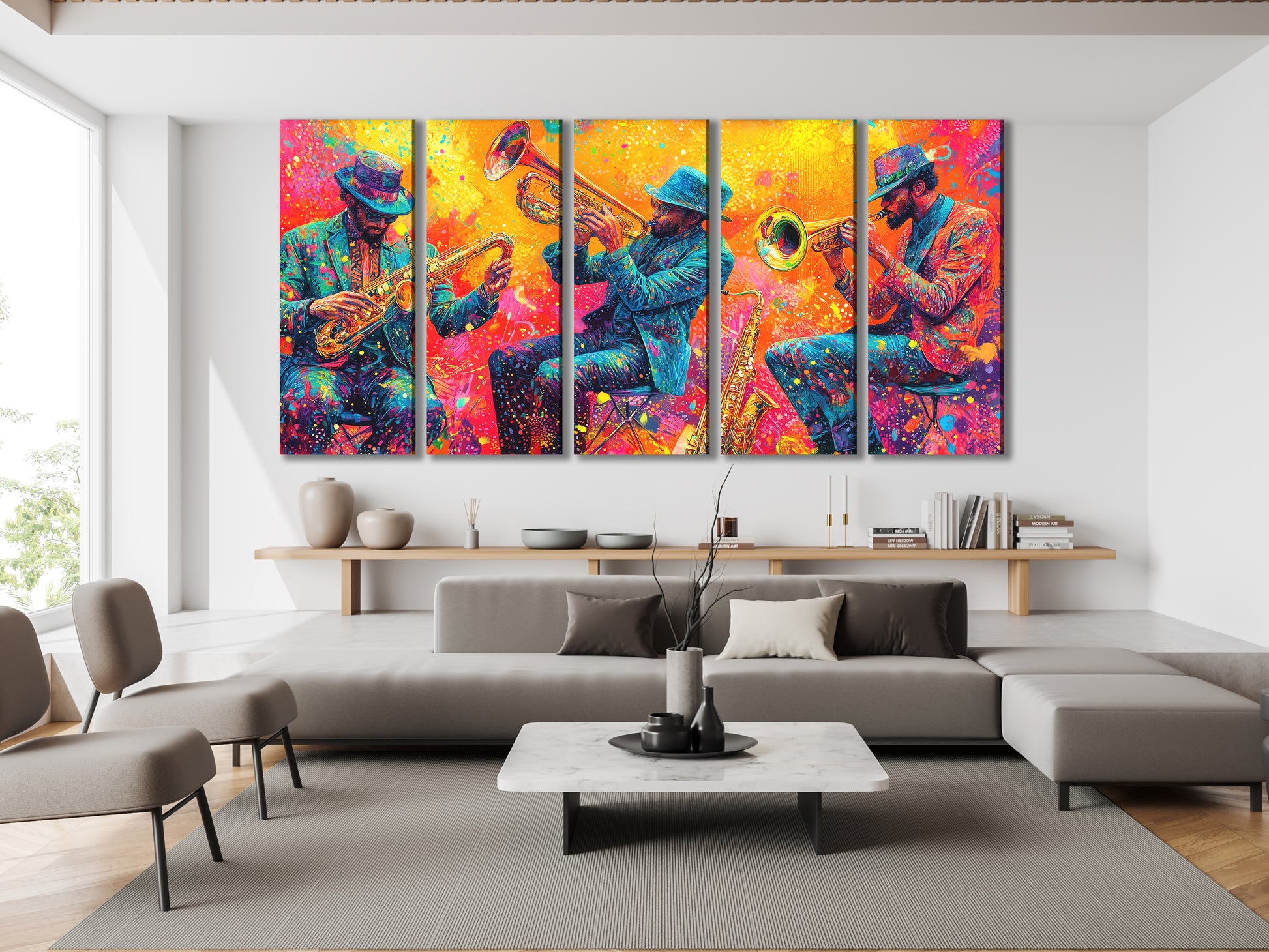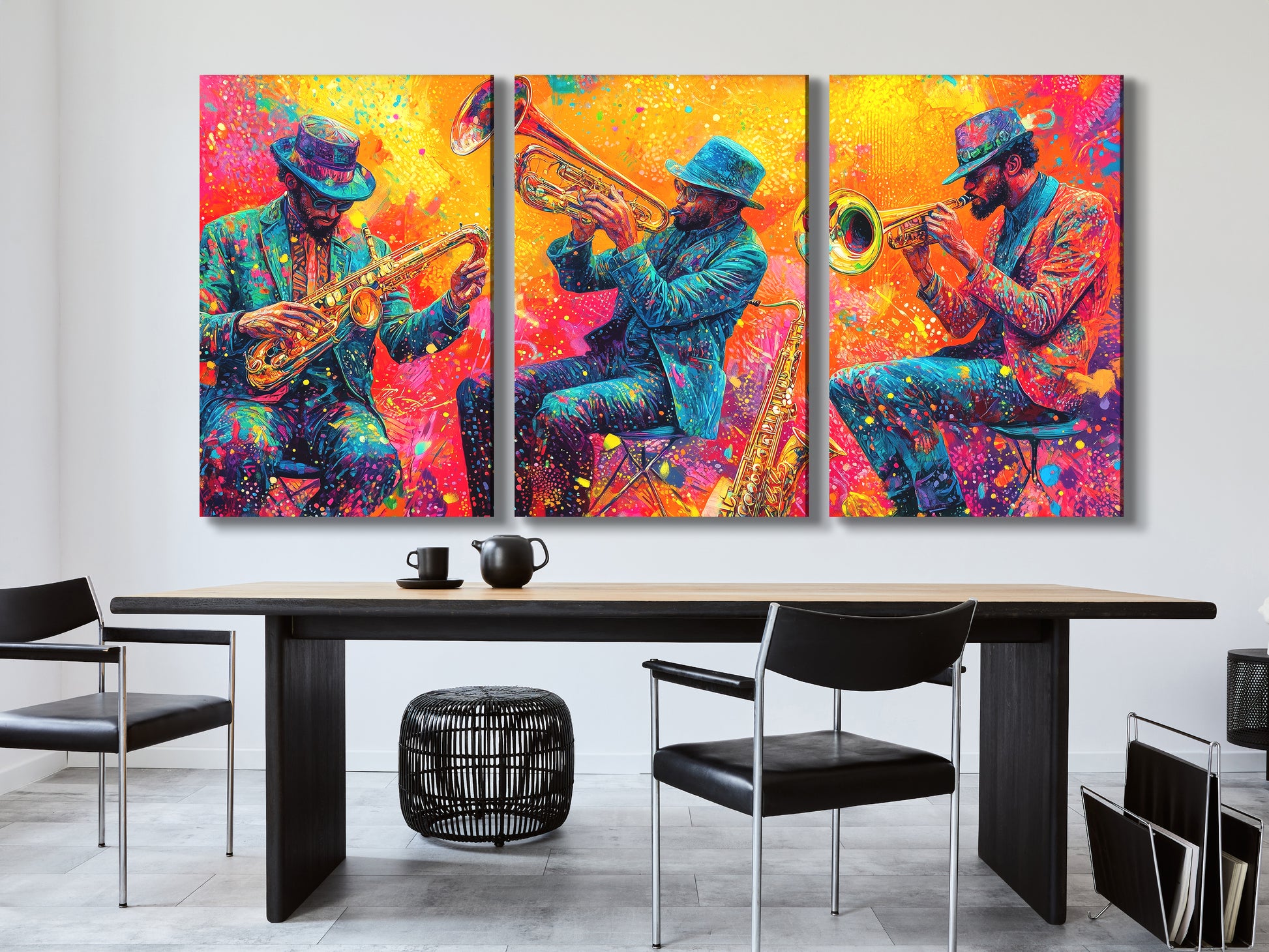 생동감 넘치는 브라스 트리오 캔버스 프린트 – 폭발적인 호른 연주자 아트워크, 재즈 펑크 페스티벌 장식