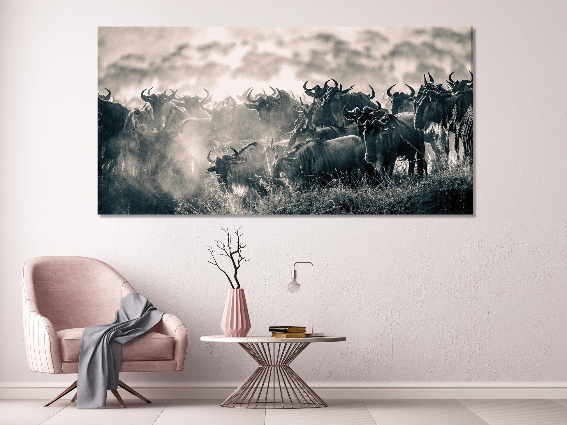 누 이동 캔버스 프린트, 대형 사파리 벽 아트, 아프리카 야생 동물 예술 작품, 마사이 마라 장식, 대이동 캔버스, 자연 프린트