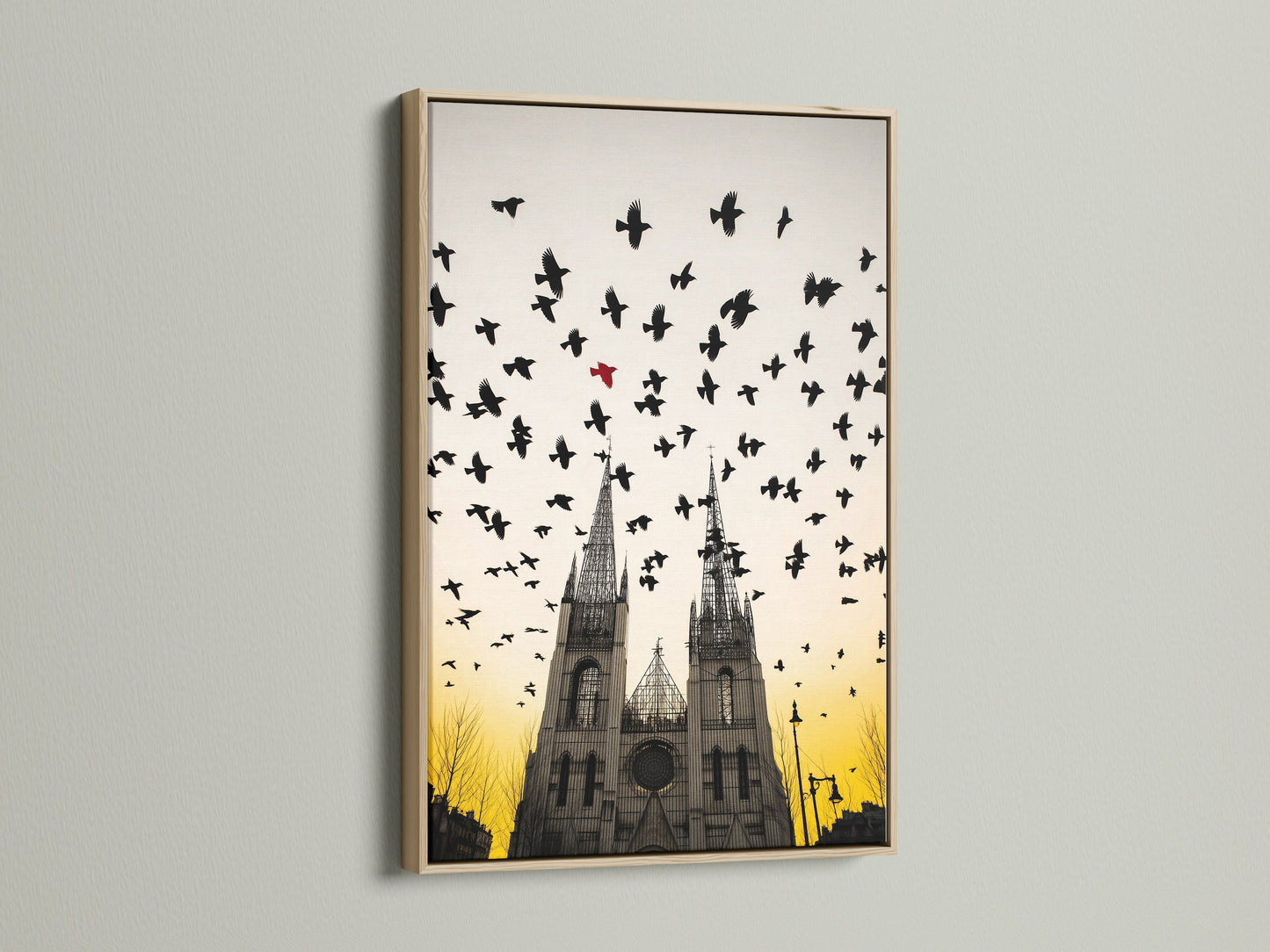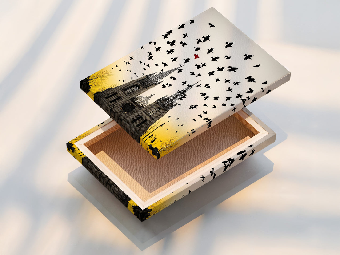 Transform your space with our captivating Cathedral Canvas Art, a stunning blend of Gothic Architecture and birds in flight imagery. This unique Wall Art piece is expertly crafted to enhance your home or office decor. Each Canvas Print showcases rich details and an ochre sky, creating a visually appealing and sophisticated look.