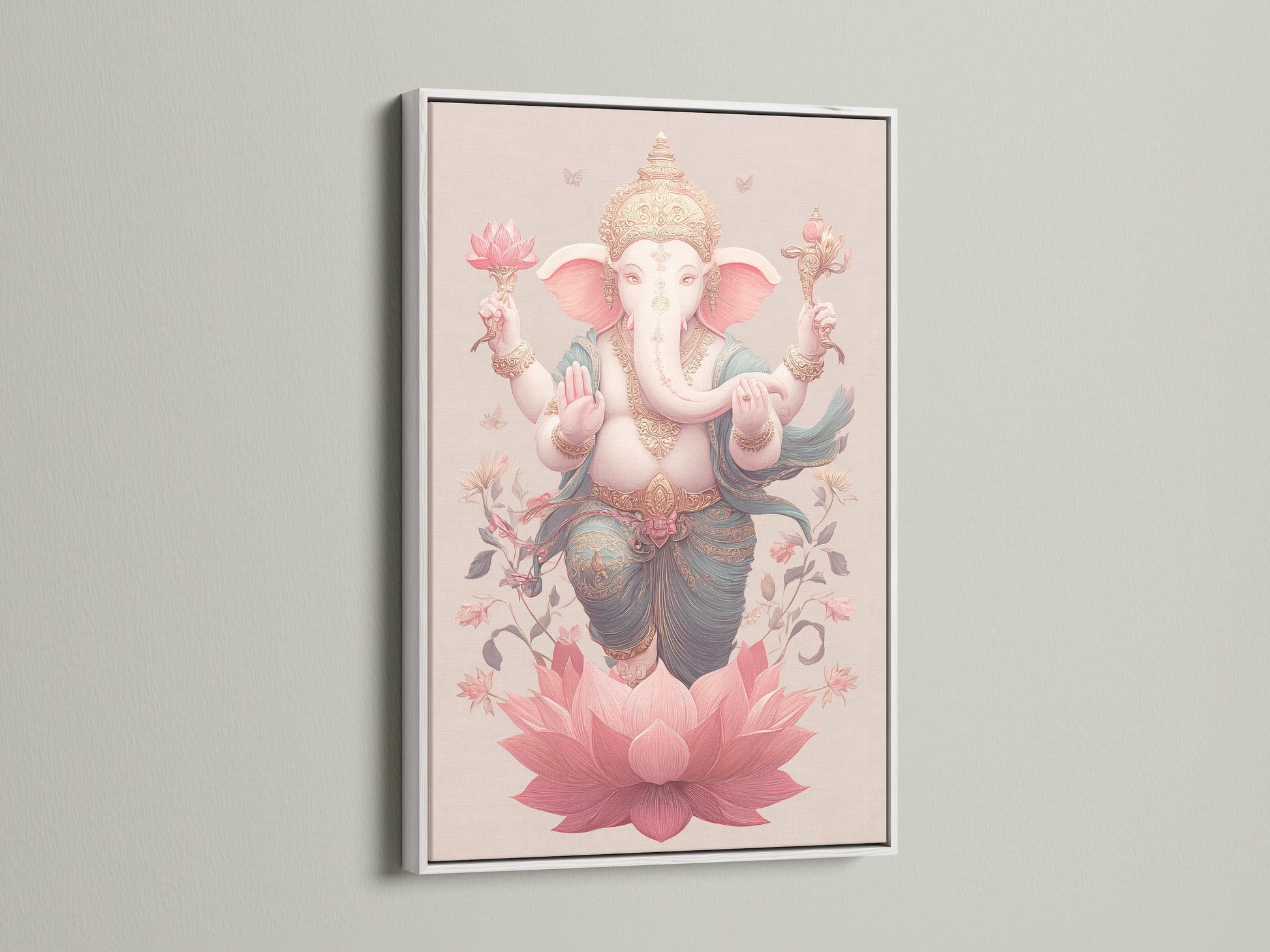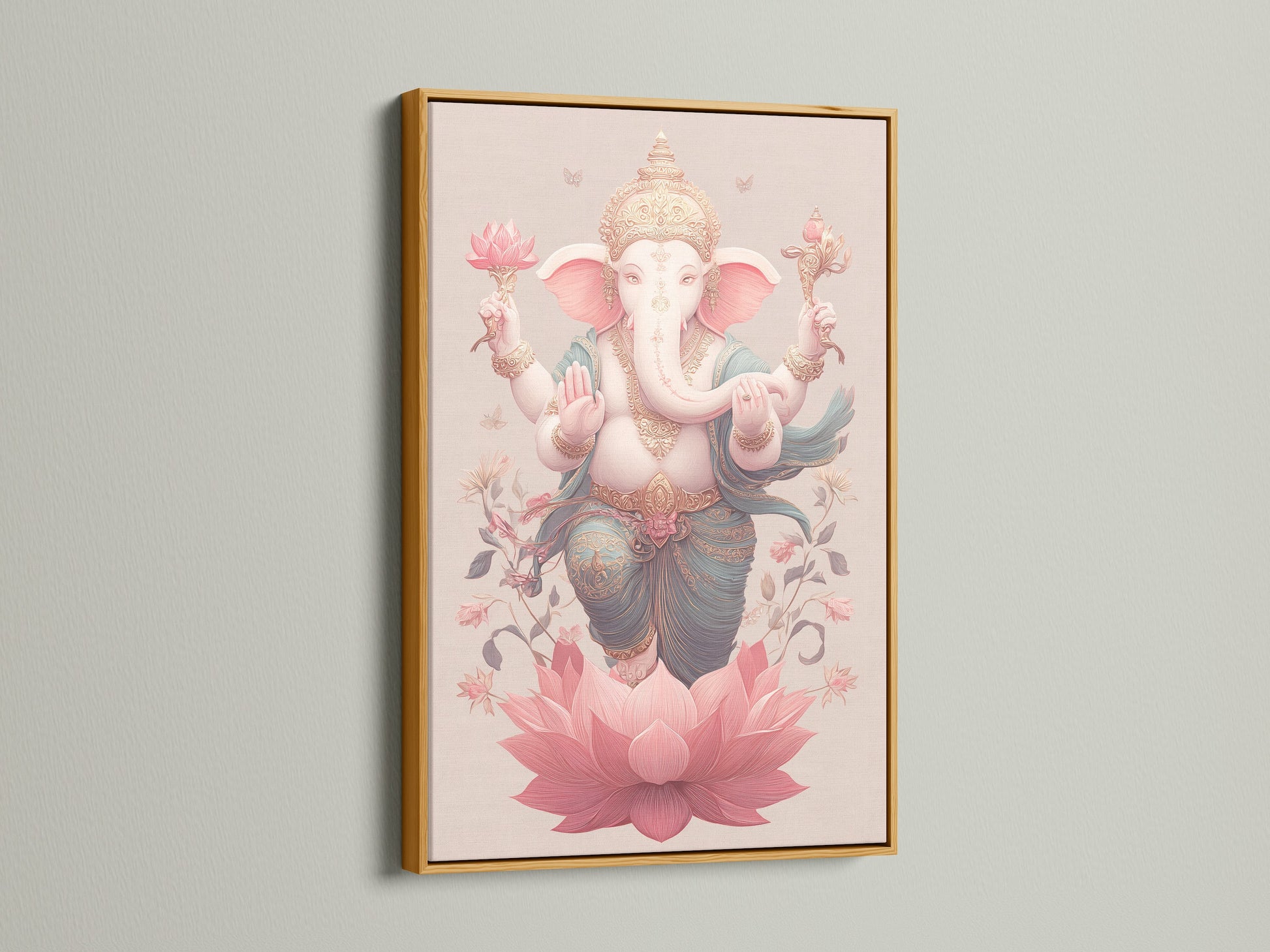 Adorn your sanctuary with this exquisite Ganesha Art Print, a blend of spiritual artistry and modern wall decor. This canvas art print showcases the beloved Hindu deity amidst lotus flowers, crafted with archival Giclรฉe pigment on premium cotton canvas. Ideal wall decor for meditation rooms, yoga studios, and homes seeking serene elegance.