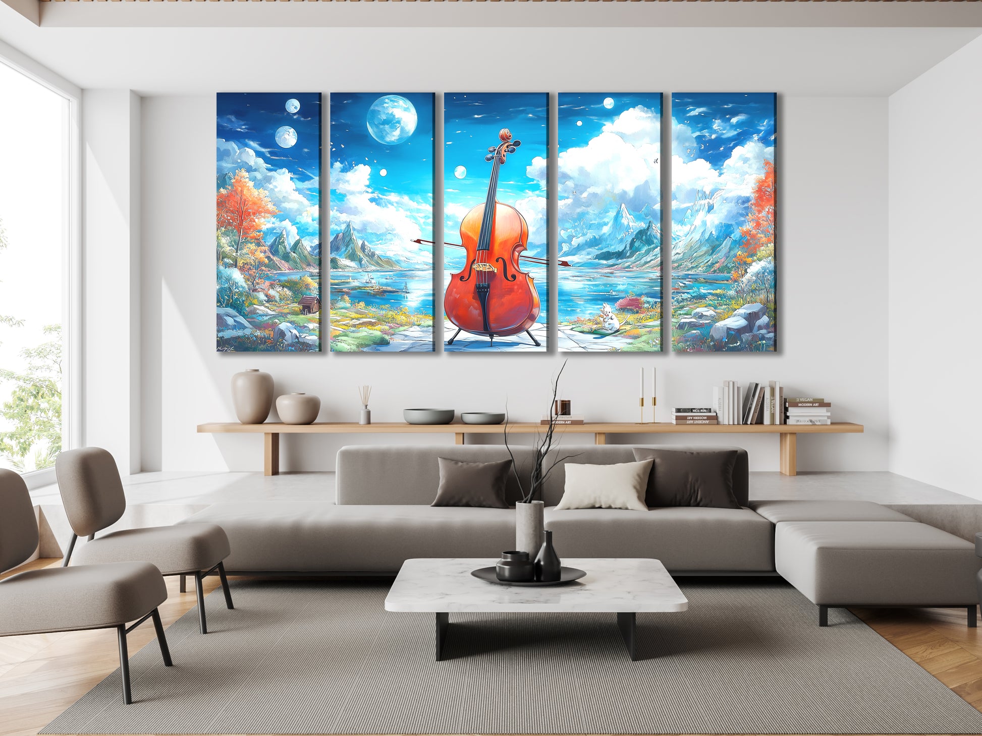 Immerse yourself in a fairytale vista with this Fantasy Cello Lake Canvas Print. A lone cello stands serenely on a lakeside path, framed by crystal-blue water, towering mountains, and a dreamy sky filled with multiple moons. The ethereal clouds and vibrant foliage convey a peaceful, almost otherworldly charm, perfect for those seeking a soothing escape in their décor. Whether you’re a music lover, nature enthusiast, or simply adore whimsical art, this piece brings a tranquil, imaginative spirit to living rooms, studios, or creative workspaces.