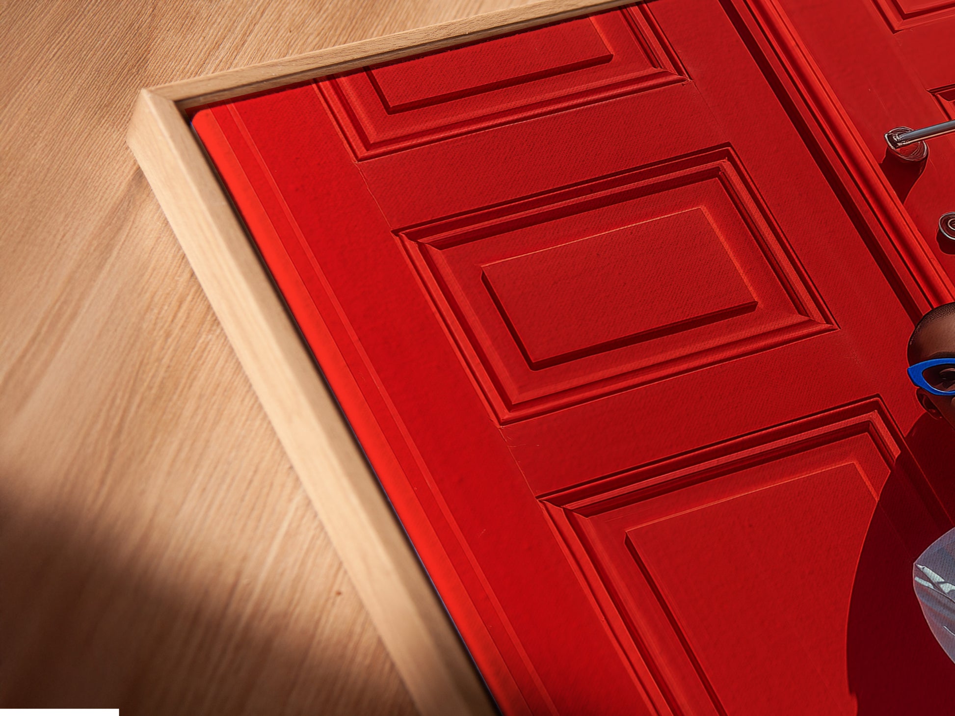 Fashion Photography Print - Blue Pattern Outfit Red Door Portrait, Modern Wall Art, Contemporary Home Decor, Style Statement