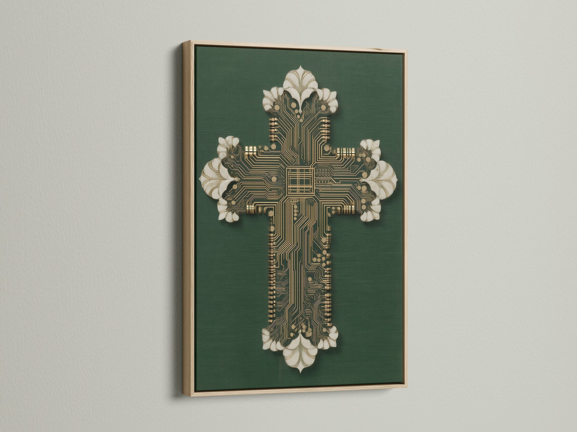 Gold Circuit Cross Canvas Art Print - Modern Tech Inspired Religious Wall Decor, Emerald Green Christian Artwork, Study Room, Office Gift