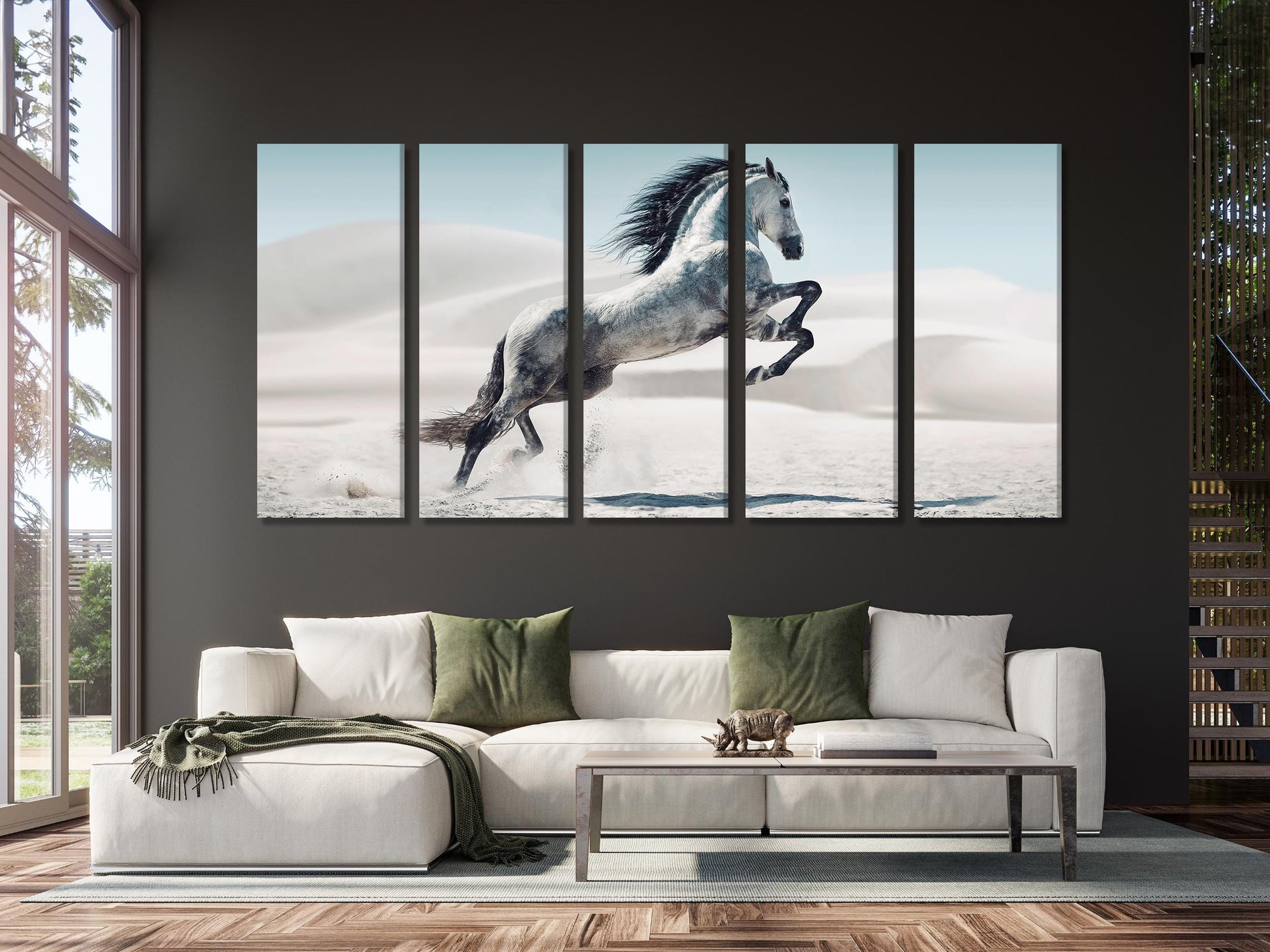 This dynamic canvas print captures the grace and power of a majestic white stallion galloping through a serene desert landscape. The horse’s flowing mane and muscular form contrast beautifully with the soft, muted tones of the sand dunes, creating a sense of freedom and strength. Ideal for nature lovers and equestrian enthusiasts, this artwork brings a sense of energy and movement to any room. The oversized format makes it a striking statement piece, perfect for adding a touch of wild beauty to your living room, office, or bedroom.