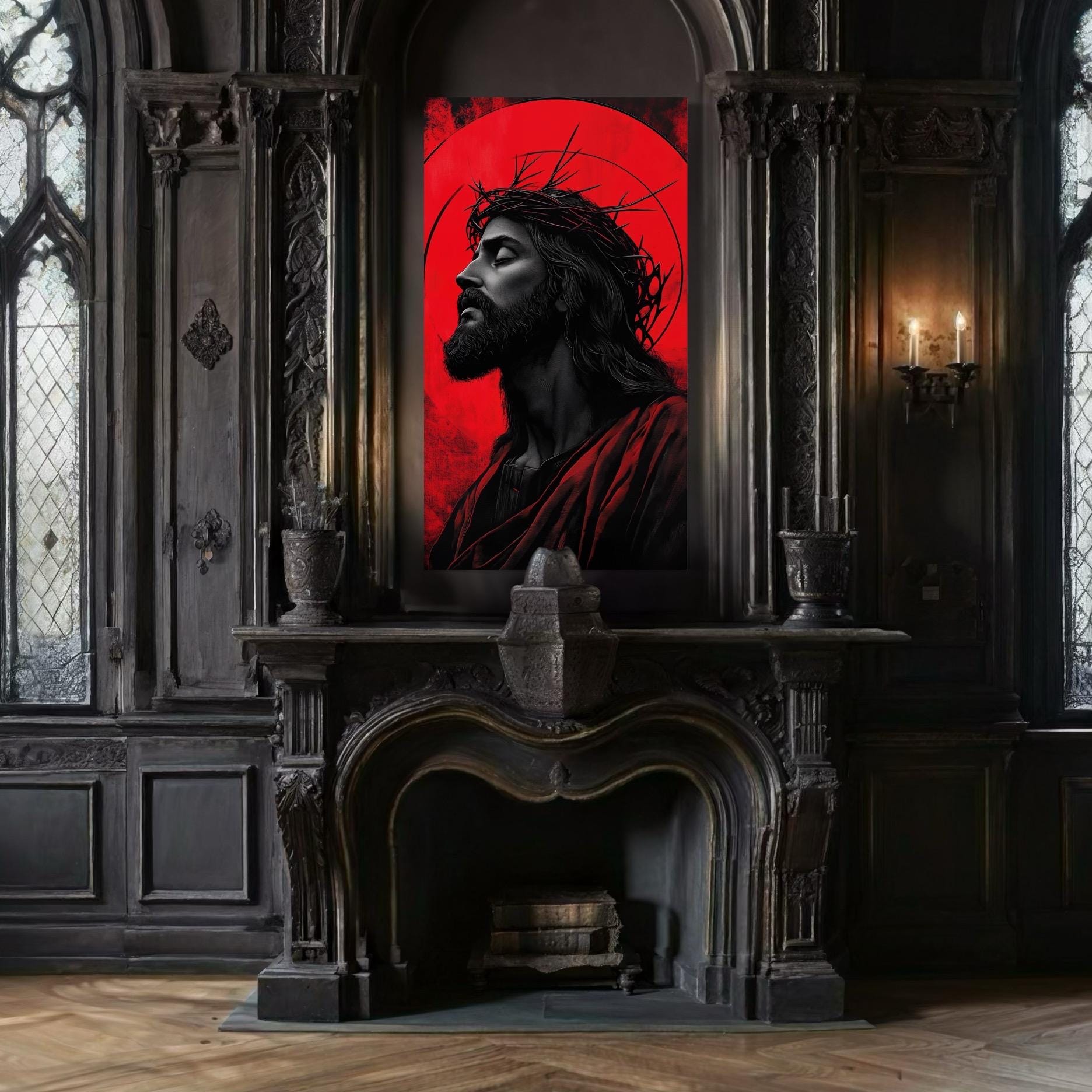 This Jesus Christ Canvas Print captures the essence of faith and devotion in a modern Jesus portrait, featuring a striking red and black color scheme. The crown of thorns artwork symbolizes sacrifice and hope, making it a powerful addition to Christian home decor.