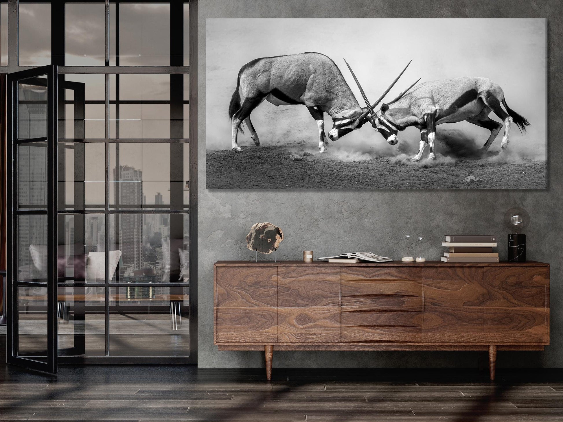 This black and white canvas print captures the raw energy of two powerful gemsbok locked in battle, making it a bold addition to any room. The high-quality print delivers striking clarity, perfect for those who admire African wildlife and want to bring that untamed beauty into their home. Available in large and oversized options, this canvas is ideal for modern or nature-inspired spaces. It comes ready to hang with pre-installed hardware, ensuring it’s easy to display in your living room, dining area, or office. With its lasting vibrancy and dramatic design, this piece offers a unique way to showcase your love for wildlife while adding a statement piece to your decor.