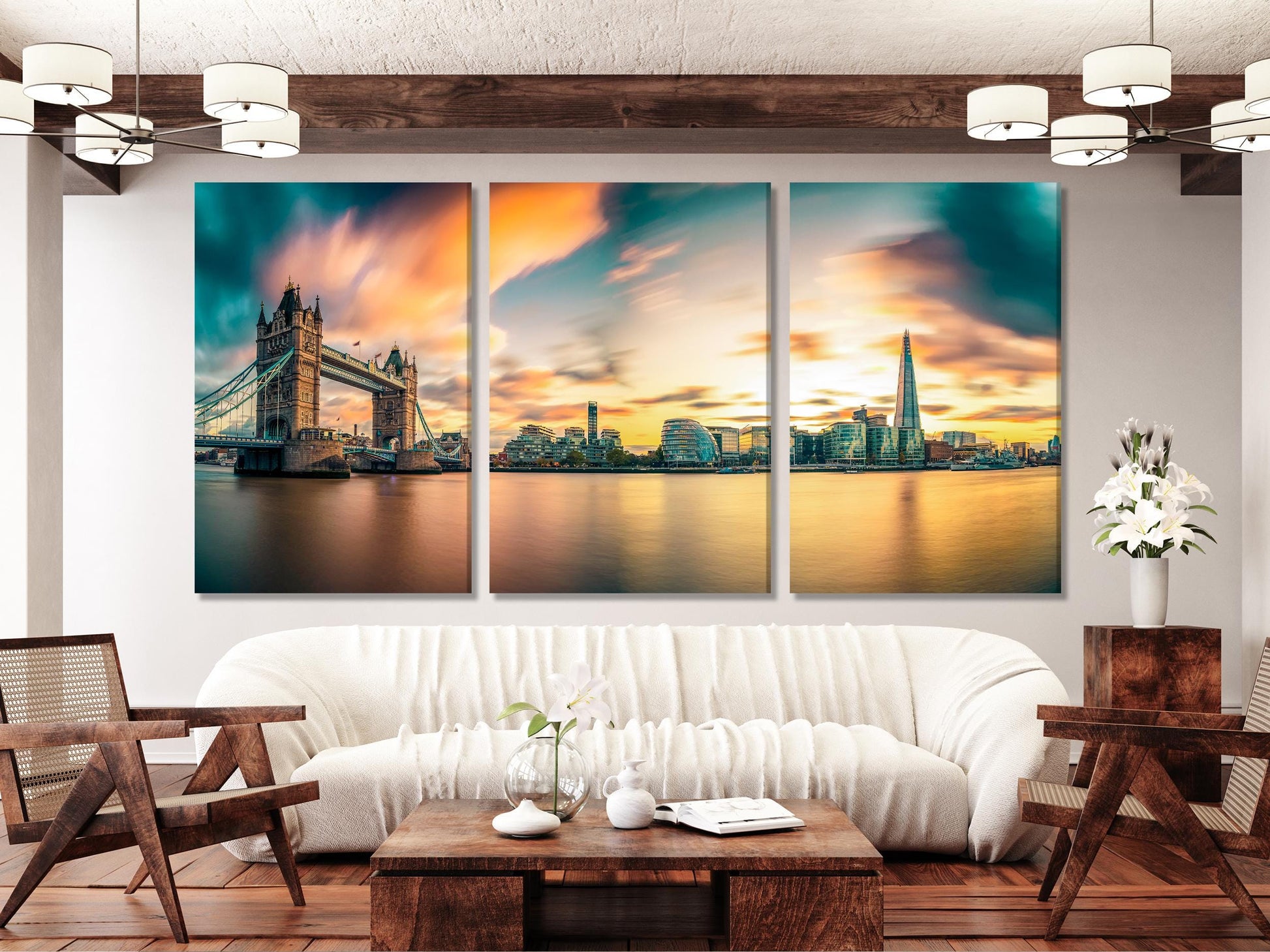 This stunning 3-panel canvas print captures the iconic London skyline at sunset, featuring the majestic Tower Bridge and the modern Shard skyscraper. The warm hues of the evening sky reflect beautifully on the Thames River, blending historic and contemporary architecture in a breathtaking scene. Perfect for lovers of British landmarks and cityscapes, this artwork brings the charm and grandeur of London into your home or office, adding a touch of elegance and sophistication.