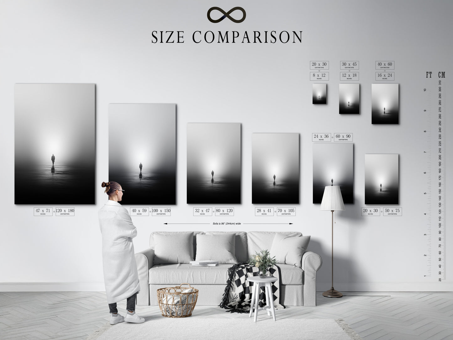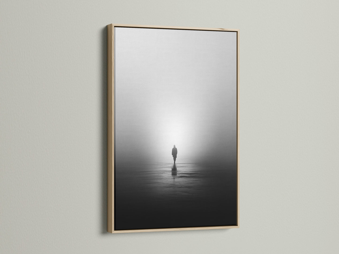 Monochrome Canvas Print - Solitary Figure on Misty Shore, Minimalist Black White Art, Modern Coastal Decor, Contemplative Art for Office