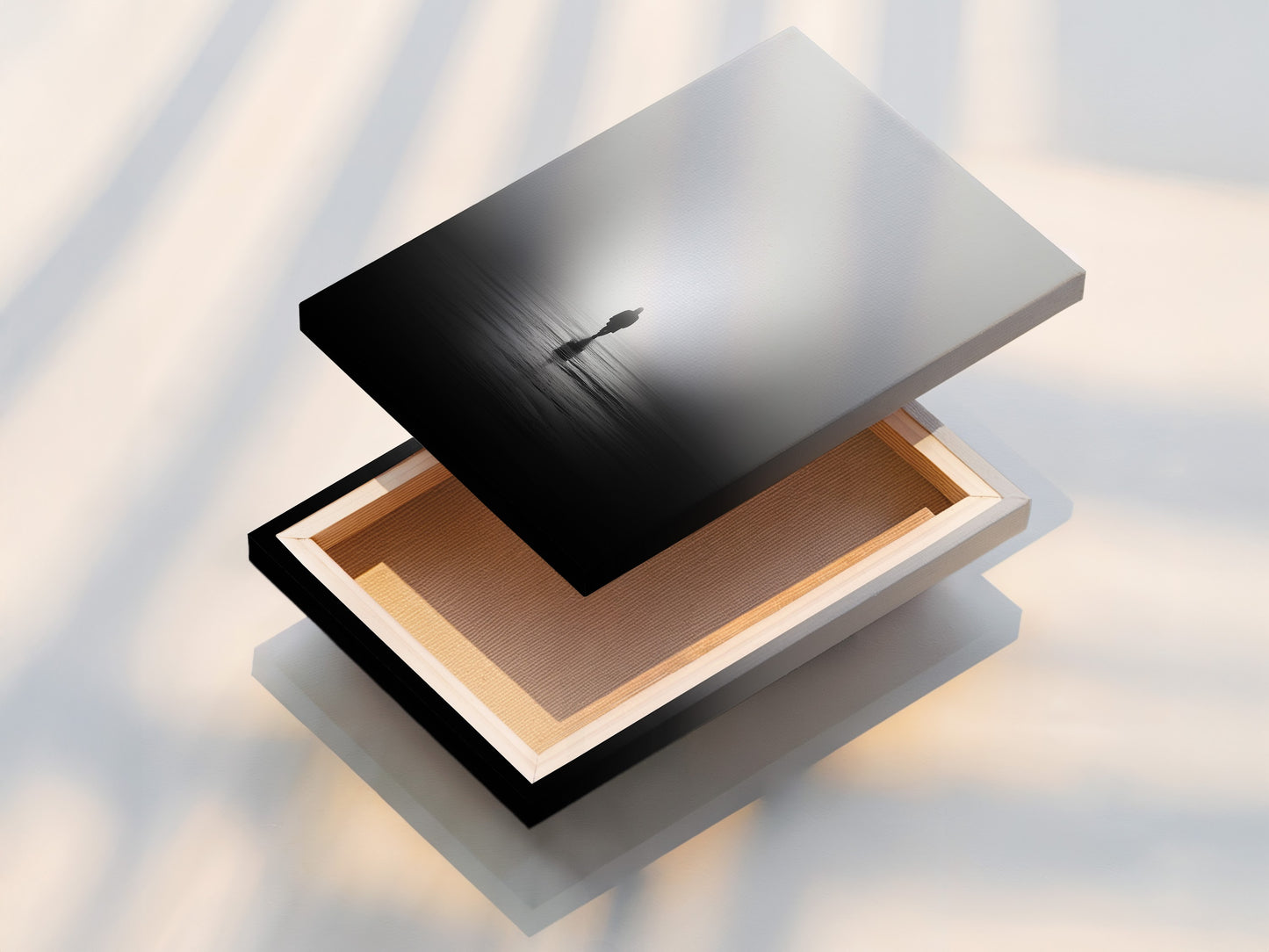 Minimalist Solitude Canvas Print - Foggy Water Reflection Wall Art, Modern Black White Photography for Office Decor