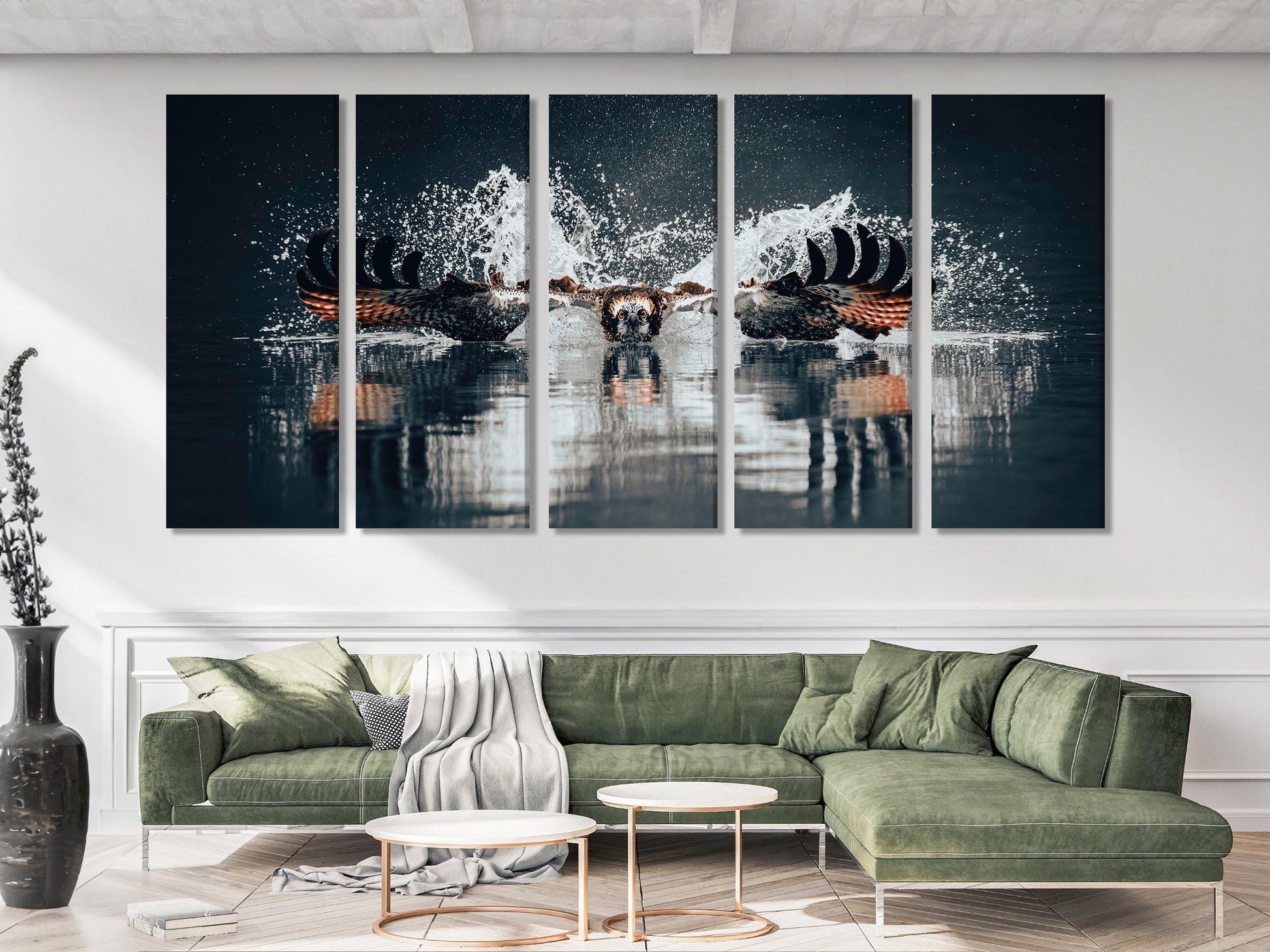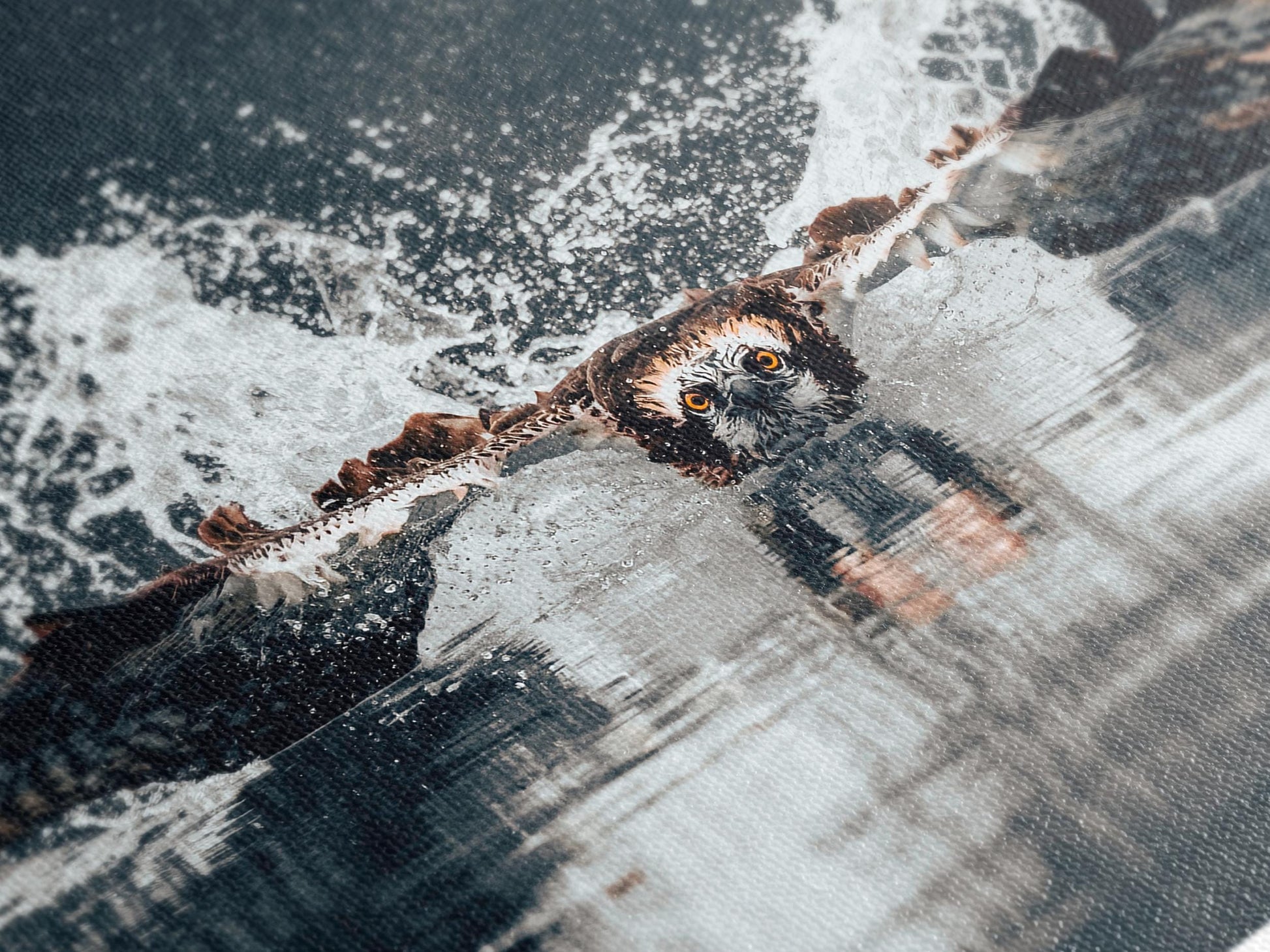 This stunning canvas print captures the dramatic moment of an osprey, also known as a sea hawk, in action as it swoops down to hunt for fish. The powerful bird of prey creates a striking splash as it meets the water, showcasing its strength and precision. Perfect for wildlife enthusiasts and nature lovers, this artwork brings the raw beauty and intensity of the animal kingdom into your home, making it an impressive focal point for any living room, office, or nature-inspired space.