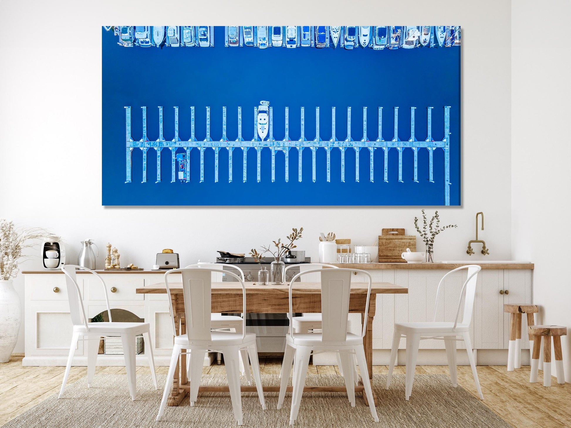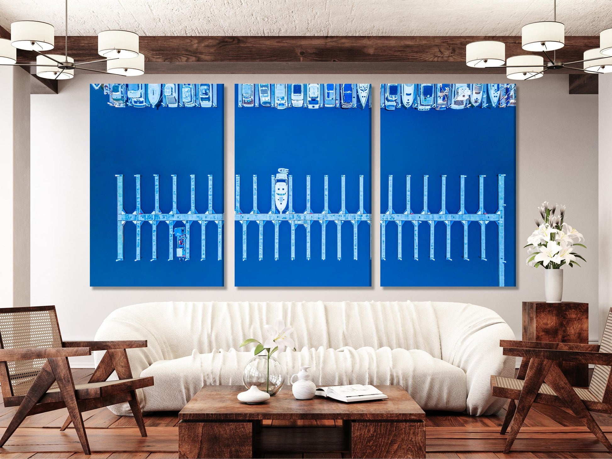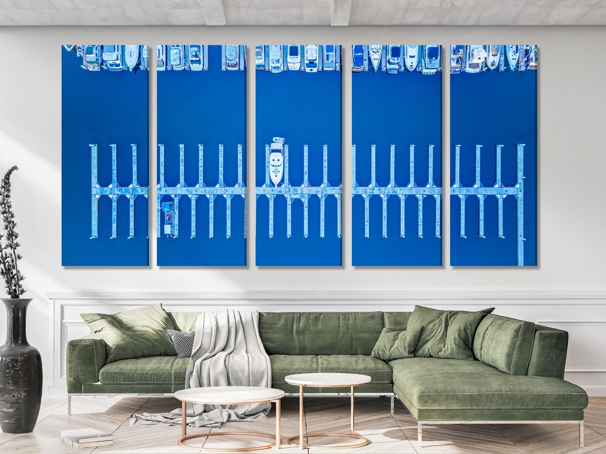 This captivating San Diego marina canvas print offers a stunning aerial perspective of the harbor, showcasing the intricate arrangement of boats docked in the deep blue waters. The striking composition and crisp details bring the tranquil yet dynamic spirit of coastal life into any space. Perfect for lovers of nautical themes and ocean views, this large multi-panel artwork enhances living rooms, offices, or coastal interiors with its serene and refreshing vibe. Crafted on high-quality canvas, this piece adds a touch of modern elegance, celebrating the beauty of San Diego's marina and maritime lifestyle.