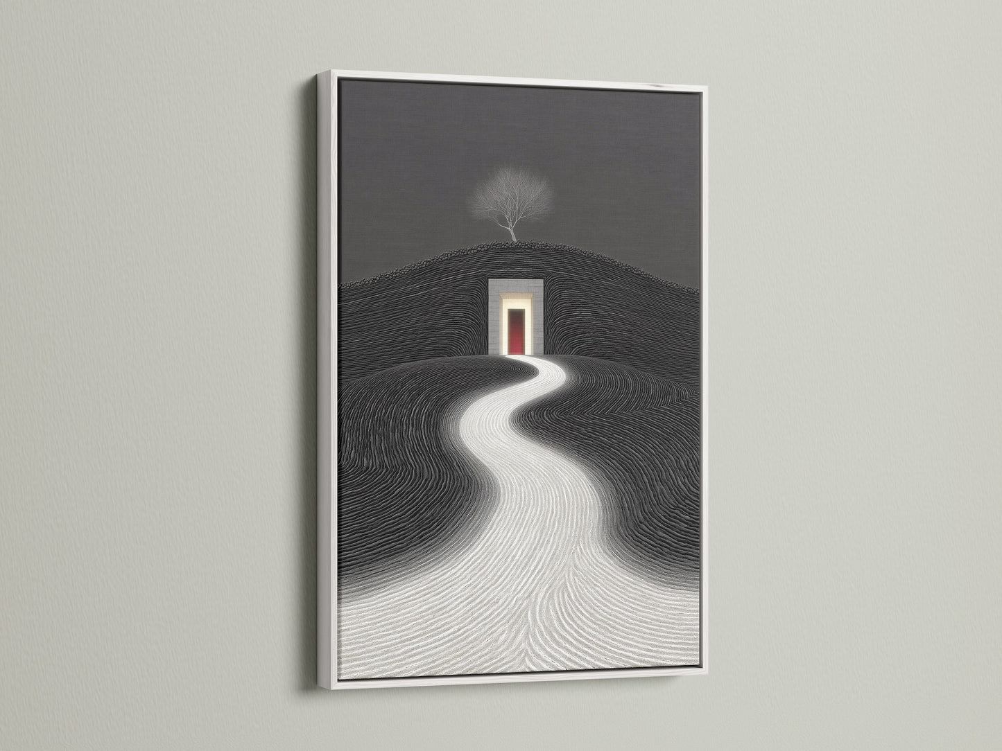 Surreal Path Canvas Print - Minimalist Black and White Landscape Wall Art, Geometric Doorway Artwork, Modern Zen Decor for Living Room, Housewarming Gift