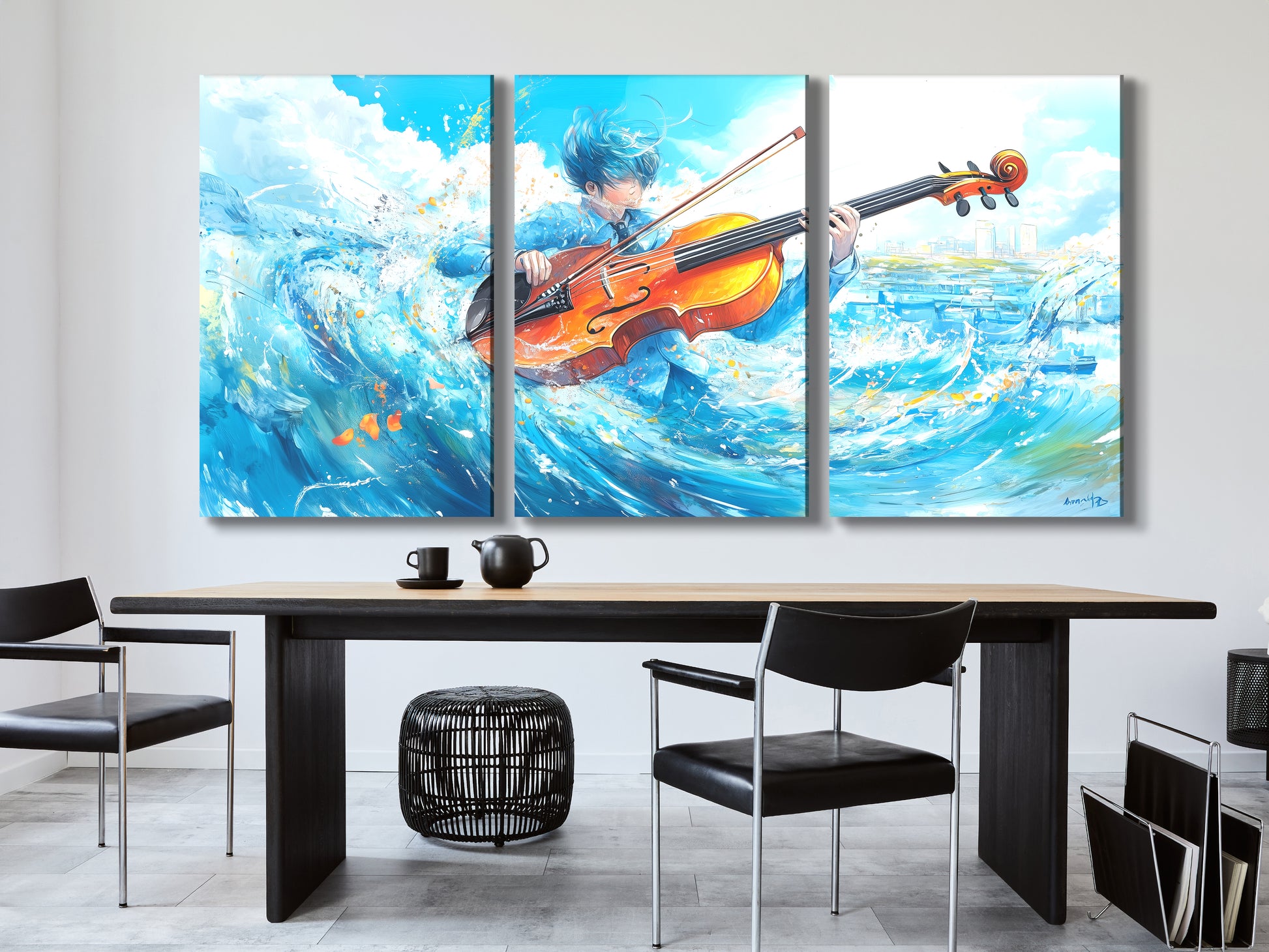 Surreal Wave Cello Canvas Print – Ocean-Themed Music Decor, Dynamic Aqua Motion Artwork