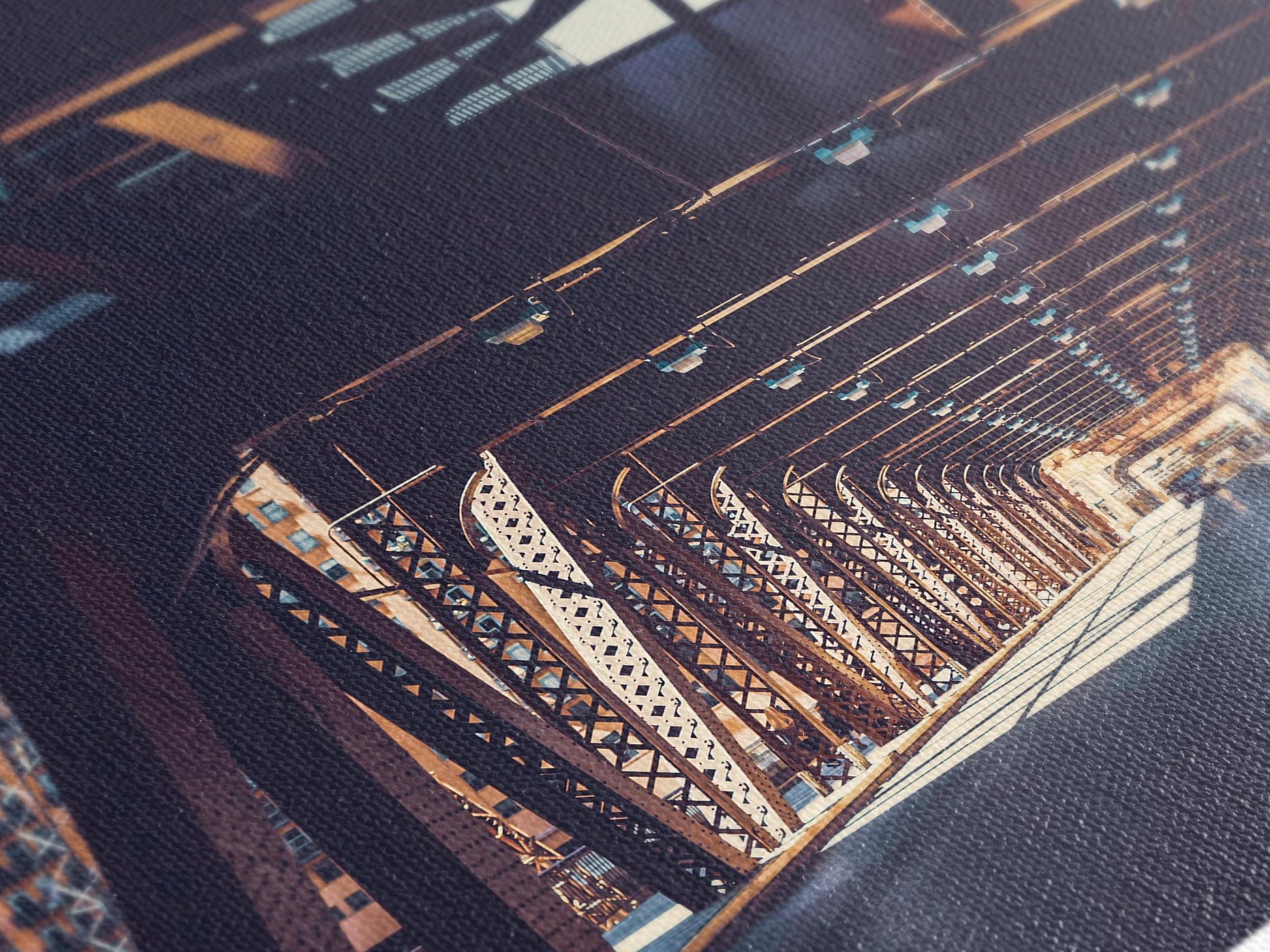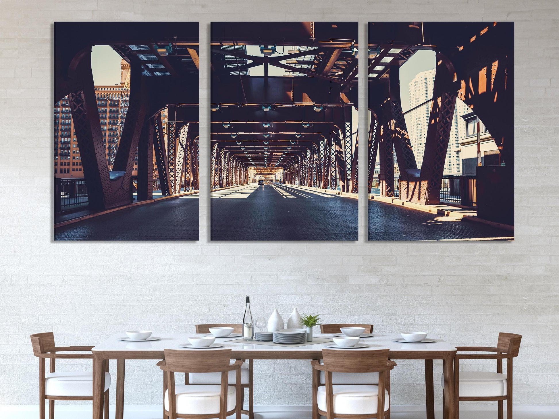This striking urban Chicago bridge canvas print captures the essence of the city's architectural beauty with its industrial design and dynamic perspective. The play of light and shadows on the steel beams creates a captivating visual, bringing the raw energy of Chicago's streets into your space. Perfect for city lovers and admirers of urban landscapes, this large multi-panel artwork adds character and a touch of modern sophistication to living rooms, offices, or loft-style interiors. Crafted on high-quality canvas, this print celebrates the spirit of Chicago, transforming any wall into a window to its vibrant urban life.