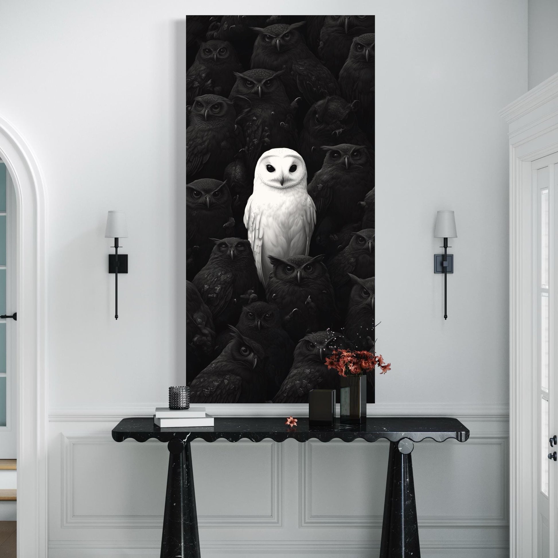 🦉 Stand out with this hauntingly beautiful White Owl Among Black Owls Canvas Art. This captivating piece blends gothic aesthetics with wildlife artistry, making it an ideal choice for those who appreciate dark, mysterious decor. The contrast between the white owl wall art and surrounding shadowy birds creates a mesmerizing focal point.