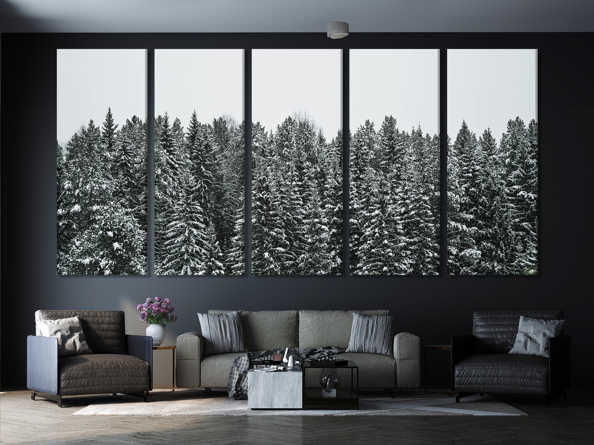 Embrace the tranquility of nature with this stunning 5-panel snowy forest canvas wall art. Featuring a peaceful winter landscape of pine trees dusted with snow, this serene artwork adds a calm and natural vibe to any living room. 🌲