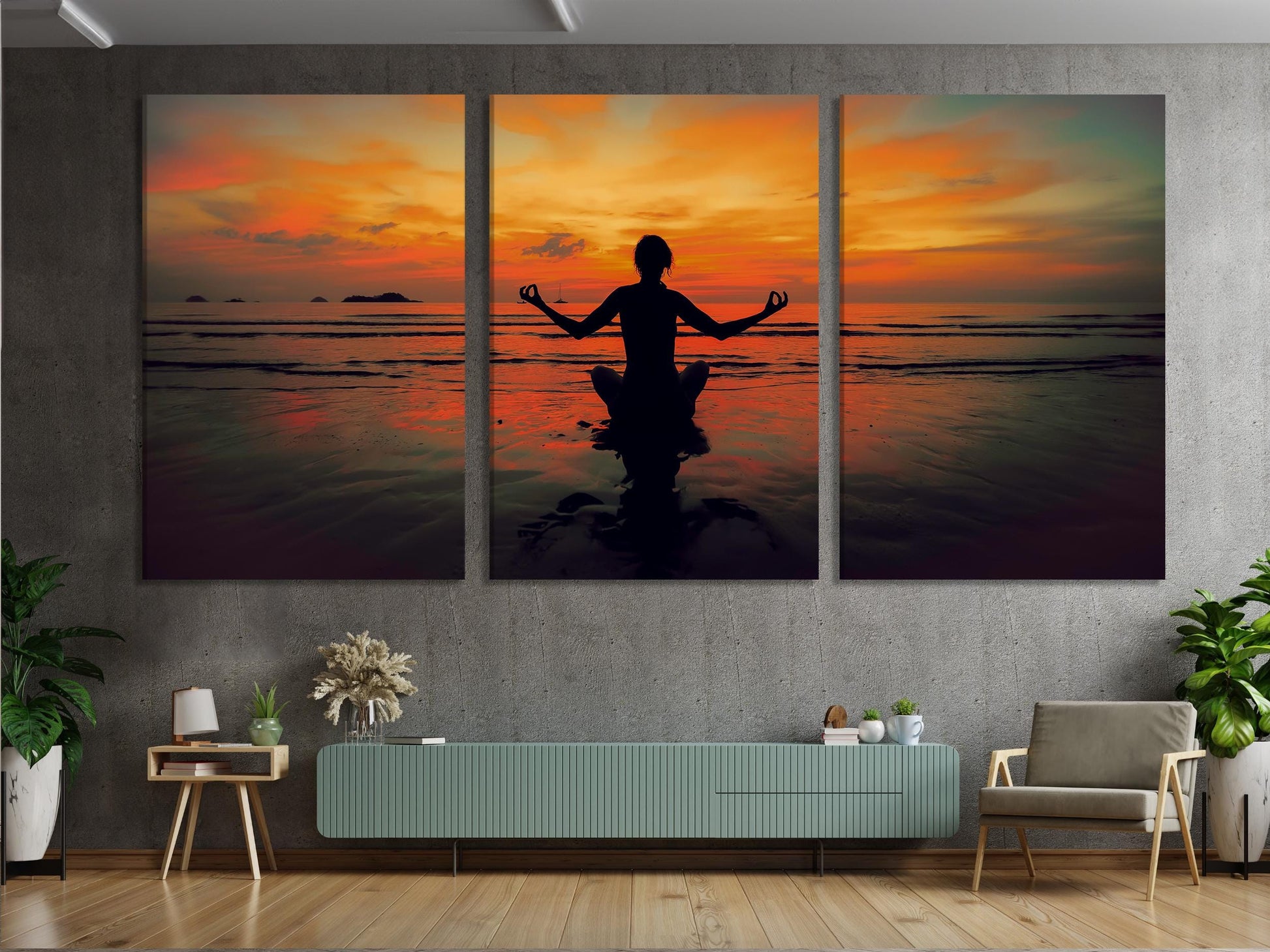 Yoga Meditation Sunset Canvas Print, Large Zen Wall Art, Peaceful Beach Silhouette Artwork, Modern Mindfulness Art Print, Calm Wall Decor